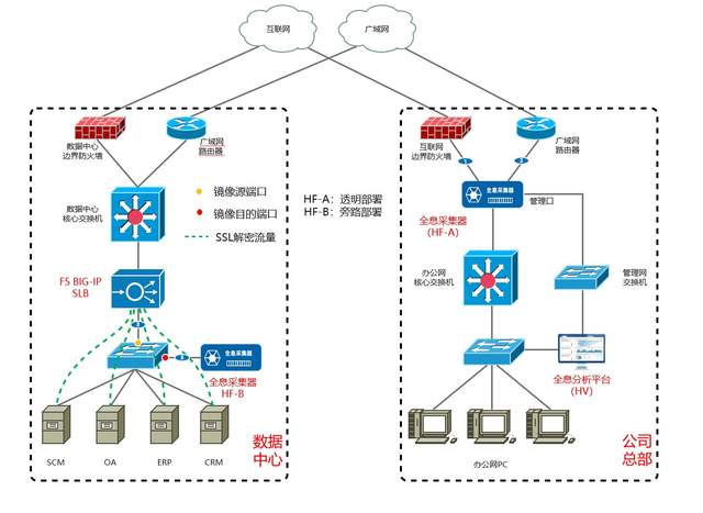 应用场景③:全面网络监测 若企业想要对网络进行全面监测,可以选择多处部署,如同时监测互联网出口流量和数据中心流量,全息提供分布式部署的方式,将采集器多点部署,统一推送到分析平台进行数据分析和可视化呈现,如下图示: