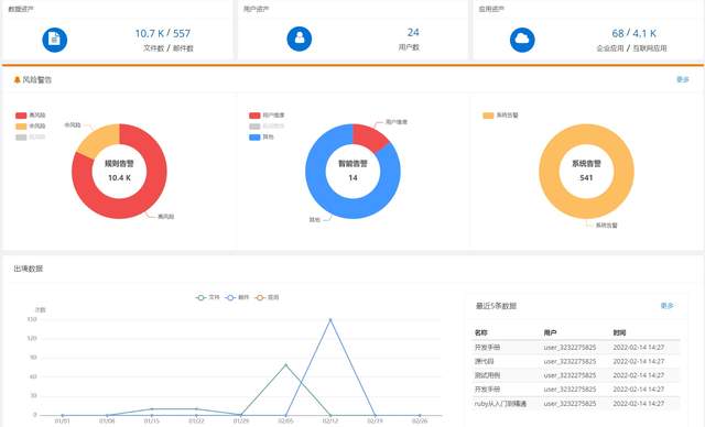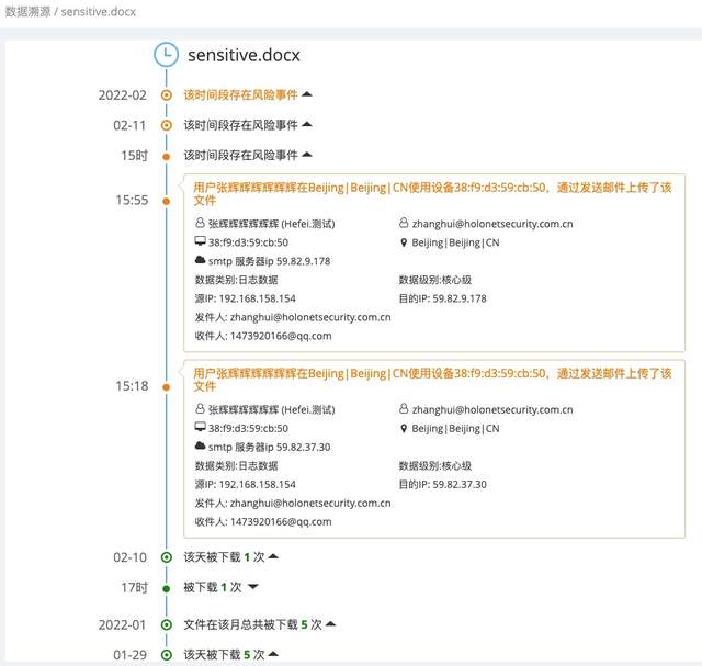 3、数据预警、告警 通过持续不断的监测网络中的数据的流动情况, 基于机器学习自动构建数据行为基线,检测偏移正常状态下的异常行为,以及异常的程度,从而进行预警;另外内置多种场景的监测和告警,提供灵活的场景条件的匹配,包括用户、应用、业务敏感性、设备、IP 地址、时间、地点等条件的组合策略,精确发现数据泄露、脱敏违规、数据滥用、违规流转等行为,实时监测和告警,有效帮助企业规避各种数据安全风险。 ![]() 4、数据溯源取证 全息数据监测溯源平台具备回溯和审计任意时间段数据行为的能力,对任何流动数据的当前和历史状况进行追溯,还原数据流转的路径及流转的范围,数据使用的访问者、发生的时间、使用设备、 IP 地址、访问行为、涉及的应用等详细信息,提供完整数据轨迹和证据链。 对每个文件在任何时刻的网络中行为进行刻画,形成以数据为核心的时间轴轨迹,展现数据在某个时刻是处在正常或异常状态,数据活动轨迹时间轴见下图示: