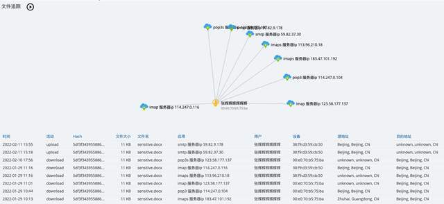 进一步对每个文件行为进行追溯和回放,从而有效、精准进行数据风险评估、溯源和审计等需求,数据活动轨迹见下图示: